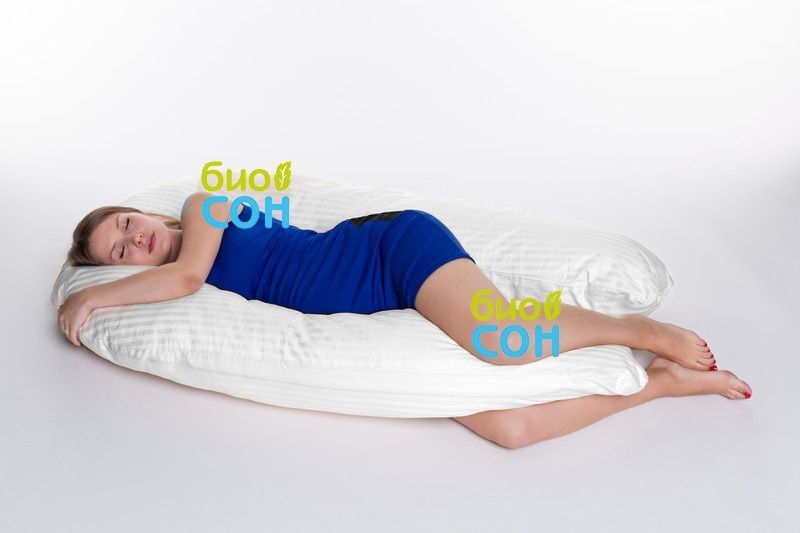 Подушка для беременных формы U с наполнителем искусственный лебяжий пух имеет размер 340 см по всей длине канта, по ширине края подушка 35 см. Наволочка на подушку U на молнии входит в комплект, ткань сатин хлопковый матовый.