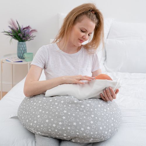 Подушка обнимашка формы Полумесяц имеет размер по всему лекалу 190 см, ширина валика 35 см, наволочка в комплекте поплин звезды на сером.
