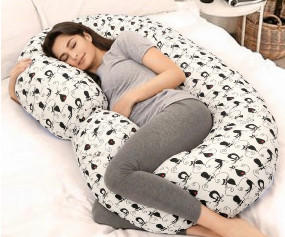 Подушка обнимашка формы Рогалик напоминает U-образную модель, но более удобна для сна за счет дополнительного элемента под голову, что значительно облегчает выход из положения лежа на последних сроках беременности. Использование подушки для беременных формы Рогалик позволяет разгрузить поясницу кормящей мамы и помочь в кормлении новорожденного крохи.