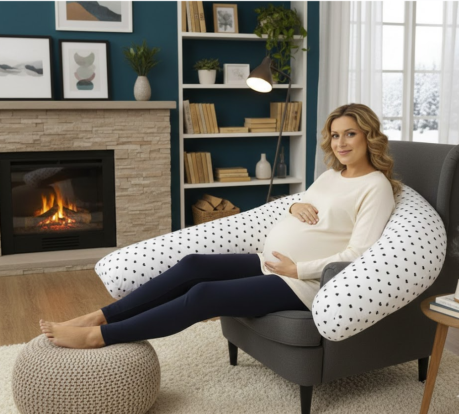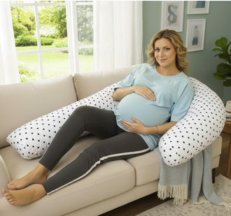 Подушка для беременных J big 280 имеет форму семерки и длину внешнему краю 280 см, ширина конца 35 см, при этом длина по высоте самых крайних точек 165 см.