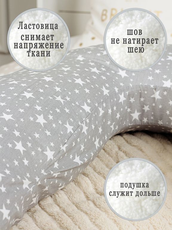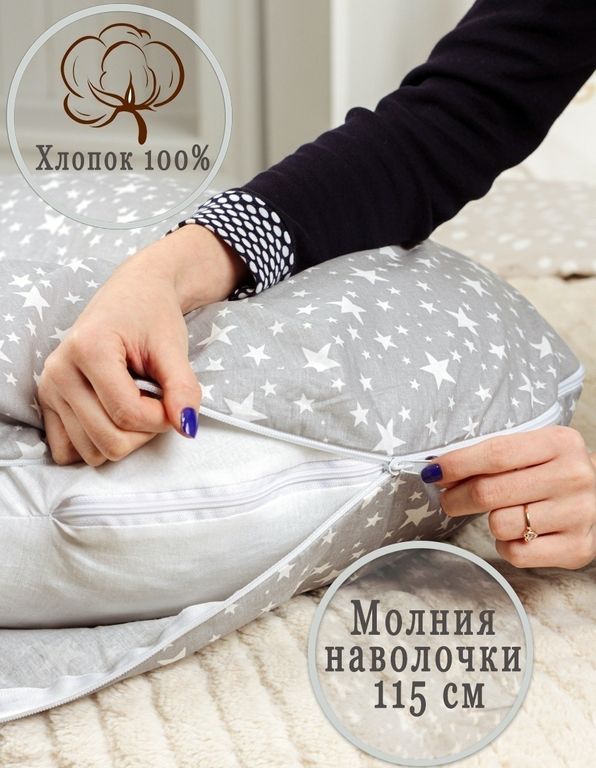 Размер подушки U 340 см по всему лекалу 340 см, по высоте 150 см, ширина одного края 35 см, внутренние вставки обеспечивают плотное прилегание.