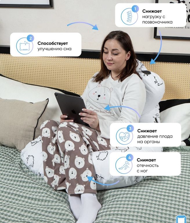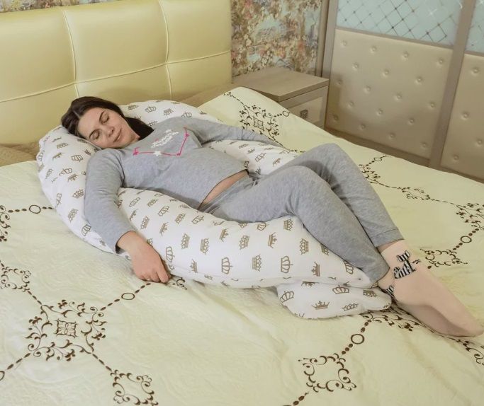 U подушка для беременных уже с первых месяцев беременности подушка станет незаменимой. Своей формой она напоминает подкову, а еще надежное гнездо, поэтому при повороте во время сна, можно не переживать что она съедет вбок.
